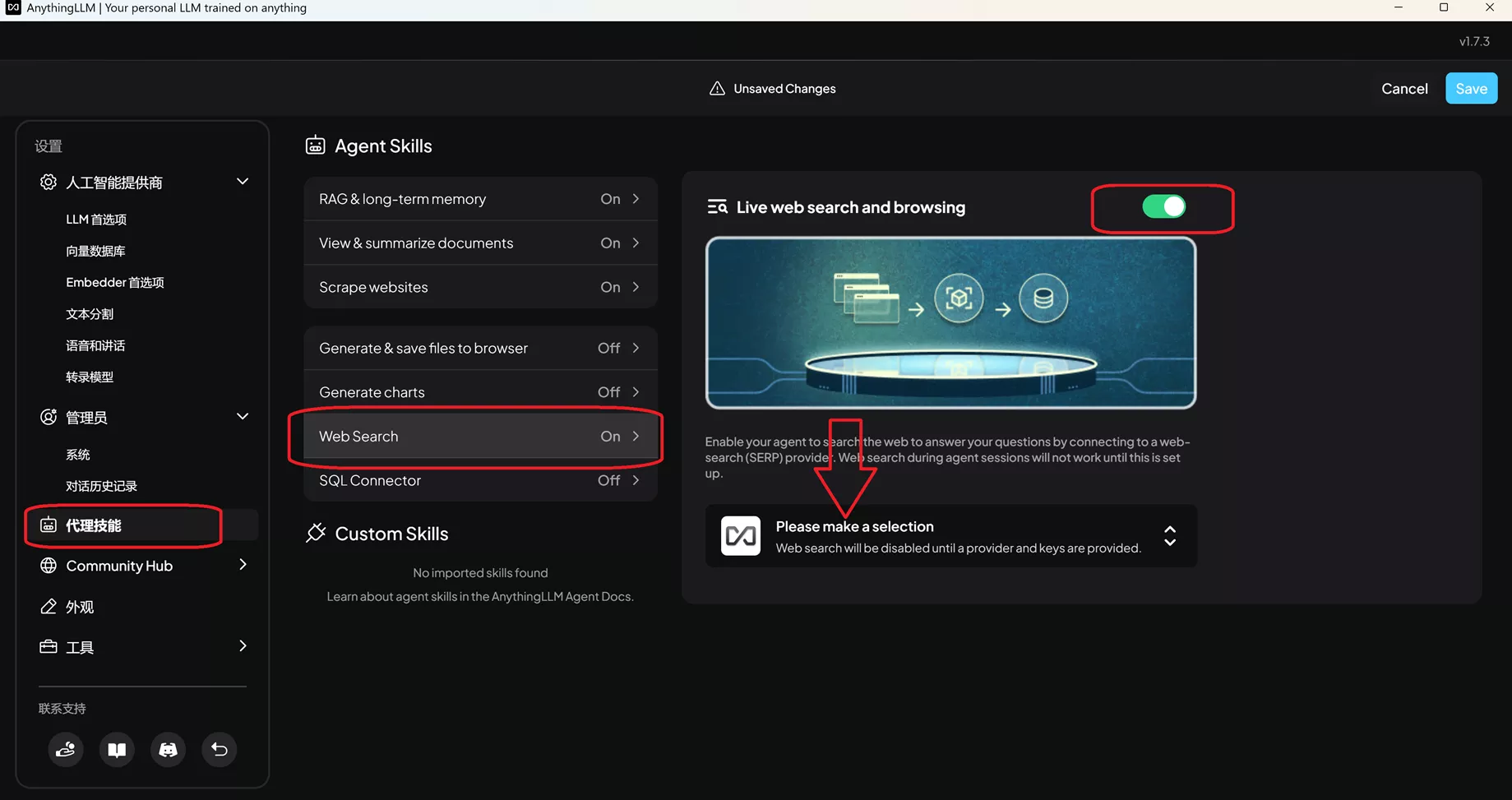 只需在AnythingLLM的设置界面中,找到“代理技能”选项。 启用Web Search:在代理技能列表中找到 Web Search ,点击开启。 选择搜索引擎即可!