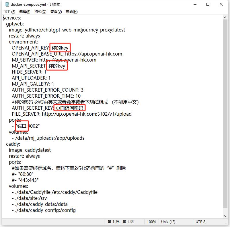 将docker-compose.yml用记事本(其他编辑软件都可)打开,需要修改4个值,如下图框中的4处